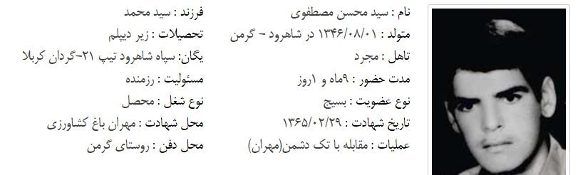 بسیجی شهید محمد صادقی فرزند محمد باقر، ولادت 1334، شهادت 25/12/1366 که در منطقه عملیاتی بیت المقدس 3 ماووت عراق به سوی معبود خویش پرواز کرد. قسمتی از وصایای شهید "شما امت حزب الله پاسدار خون شهیدان هستید و از انقلاب اسلامی و جمهوری اسلامی و ولایت فقیه حمایت کنید و بدانید که این انقلاب ثمره خون صدها هزار شهید، مفقود و معلول است و مستضعفین جهان چشم امید به این انقلاب دارند."