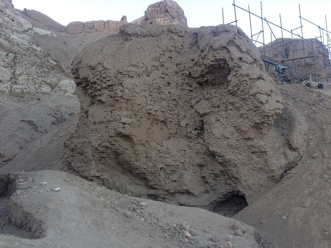 گذشته از این اشتباه فاحش، جای کنده کاری های زیادی در جای جای این محوطه تاریخی دیده می شود که حکایت از فعالیت کسانی دارد که به دنبال عتیقه جات می گشتند. این قلعه بر قله ایی قرار دارد که از هر سویش حالتی دارد، که هجوم دشمن را بر آن کم اثر می کند، هر چند برخی از وجه های این قله غیر قابل صعود تر است، و برخی راحت تر، که من از جناح سمت مسجد جامع کرمان، برای صعود اقدام کردم، که شاید از راحت ترین مسیرها به سمت قله و قلعه بود، وجه مقابل این مسیر از سمت دیگر قله، صخره ایی و دیواره است، در قسمت سمت راست مسیر صعودم که بیشترین لایه های دفاعی و دیوارها در آن قرار درد و در واقع ضربه پذیرترین مسیر، در اطراف قلعه است، که بیشترین استحکامات نیز در این قسمت قرار دارد، دیوارهایی که به صورت چند لایه از مرکزیت قلعه در بالاترین نقطه قله حفاظت می کنند و البته بیشترین ویرانی نیز در همین ناحیه اتفاق افتاده است، که ترمیم این قلعه تاریخی نیز از همین جهت شروع شده و ادامه دارد، که این امر حکایت از تصمیم مسولین سازمان میراث فرهنگی کشور برای حفظ و ترمیم این بنا دارد، تصمیمی دیرهنگام و در مقیاس کوچک.