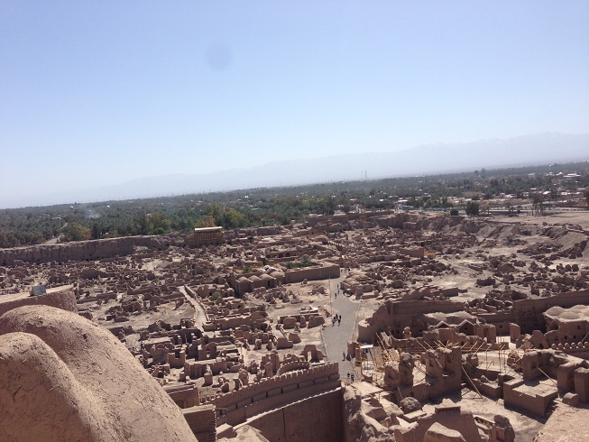 بم در وسط این بیابان حاشیه کویر، بهشتی جنگلی از درخت های مفید و پر بار را برای ایرانیان تدارک دیده است؛ و نام این شهر زنده به هدایایی است که خداوند برای بشر در این تیکه از بیابان وسیع قرار داده. وقت زیادی برای دیدار از شهر بم و دیگر دیدنی هایش از جمله ارگ جدید بم، نداریم؛ تنها از خیابان هایش گذری کرده و به نظاره شهر و مردمی نشستم که روی "گنج بم" نشسته اند، گنجی پایان ناپذیر، که خداوند تداومش را برای هزاران سال تاکنون تضمین کرده و انشالله برای آیندگان هم خواهد کرد؛ تا چون نگینی همچنان بر تارک کرمان بدرخشد، و چون شهرهای غنی دیگر کرمان، بزرگانی را به جامعه ایران همچنان تقدیم کند. بعد از توقف کوتاهی برای نماز در این مسجد که اعمال و مناسبت های ماه رجب را کامل در آن زده بودند، یکراست به سوی بهشت خشت و گل جهان، و ارگ تاریخی بم سرازیر شدیم.