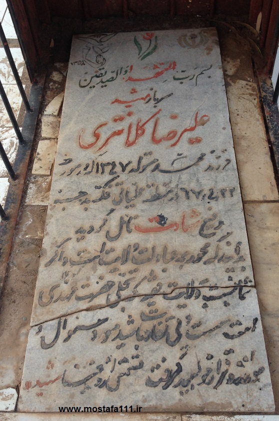 - بسم رب الشهدا و الصدیقین، برادر سرباز شهید علیرضا کلانتری، فرزند محمد متولد 1347 که در مورخ 22/4/1367 در منطقه عملیاتی فکه بدرجه رفیع شهادت نایل گردید." بدانید که محور همه عبادات ولایت است و اگر شما نسبت به ولایت فقیه که تجلی حضرت مهدی است، سست و بی تفاوت باشید مورد سوال و مواخذه خداوند قرار خواهید گرفت." قسمتی از وصیت نامه شهید