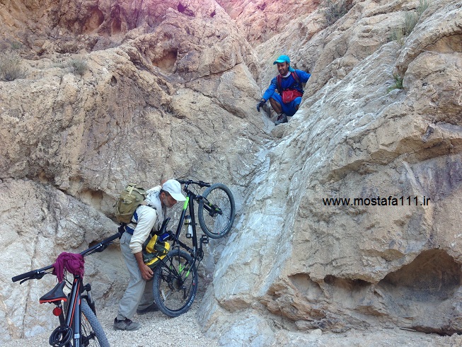 ساعت 9 و 55 به جایی رسیدیم که دیگر در سرازیری های تند و نسبتا پرتگاه، نمی توان دوچرخه سواری کرد، بلکه باید در حالت "گهی زین به پشت"، [8] با احتیاط و پیاده بقیه مسیر را تا ته دره طی کرد. کف دره شرایط برای سوار شدن بر دوچرخه در میان سیلاب ها تا حدودی با افت و خیز مهیاست،