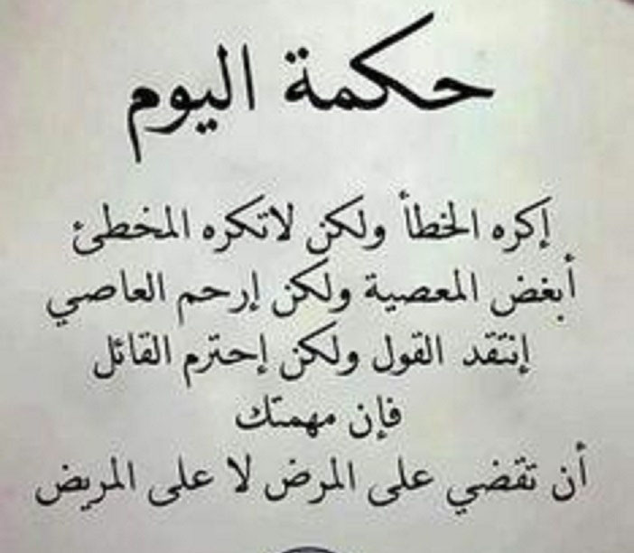 حکمتی را در رسانه های مصری دیدم که می گوید : "از خطا متنفر باشید، ولی از خطا کار اکراه نداشته باشید، بر گناه خشمناک شوید، ولی بر گناهکار رحم کنید، به گفته ها انتقاد کنید، اما به گوینده آن احترام بگذارید، وظیفه شما این است که بیماری را از بین ببرید و نه بیمار را"