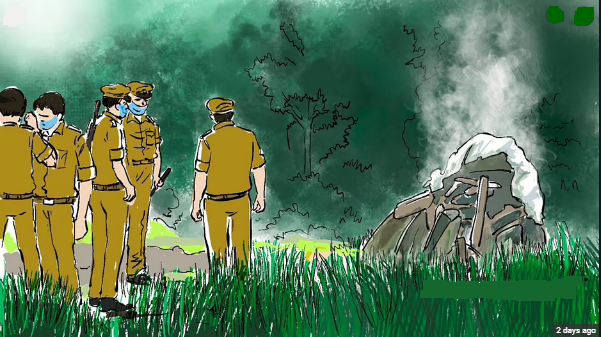 کاریکاتوری از صحنه سوزاندن مدرک جرم، جسد این دختر توسط پلیس در ساعات نصف شب