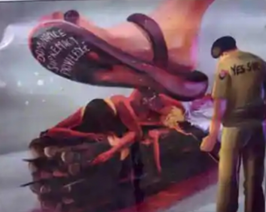 دو نماد، تقدیم جسد در حال سوختن قربانی توسط پلیس به روحانی حاکم هندو و دیگری نماد حمایت از قربانی دالیت توسط گروه های مدنی
