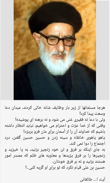 هرجا مسلمان ها از زیر بار وظایف شانه خالی کردند، میدان دعا وسعت پیدا کرد! ولی با دعا نه فقیری غنی می شود، نه برهنه ایی پوشیده! وقتی که از خدا عزت و احترام می خواهیم، نباید انتظار داشته باشیم که خداوند آن را از آسمان برای مان فرو ریزد! یاهو یاهوی خانقاه و سینه زدن و حسین حسین گفتن درد اجتماع را دوا نمی کند، به جای این که بر فرق و تن خود زنجیر بزنید، به پا خیزید و زنجیرهای را بر فرق یزیدها و معاویه های ظلم که مصدر امور هستند بزنید، نه بر فرق خودتان، حسین بن علی قیام نکرد که تو برای او گریه کنی! آیت الله سید محمود طالقانی