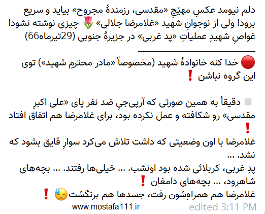 "دلم نیامد عکس مهیج "مقدسی رزمنده مجروح" بیاید و سریع برود! ولی از نوجوان شهید غلامرضا جلالی چیزی نوشته نشود! خدا کند خانواده شهید (مخصوصا مادر محترم شهید) توی این گروه (تلگرامی) نباشند! دقیقا به همین صورتی که آر.پی.جی ضد نفر پای علی اکبر مقدسی رو شکافته و عمل نکرده بود، برای غلامرضا هم اتفاق افتاد! غلامرضا با اون وضعیتی که داشت تلاش می کرد، سوار قایق بشود که نشد (نتوانست) ... پد غربی، کربلایی شده بود آن شب... خیلی ها رفتند، بچه های شاهرود... [15] بچه های دامغان! غلامرضا هم همراه آنان (همه ی شهدای آن شب) رفت، جسدها هم برنگشت!"