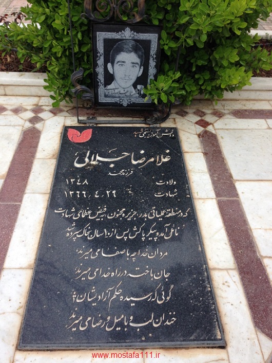 آن موقع ها 14 سال سن داشتم و شهید غلامرضا جلالی تنها چهارماهِ شناسنامه ایی از من بزرگتر بود، اما او دو سال بعد، یعنی در 29 تیرماه 1366 در حالی که تنها 17 سال و 5 ماه و 18 روز طول عمر از خدا گرفته بود، و در نوجوانی و در سرزمین جنگ های آبی – خاکی، یعنی در جزیره مجنون جنوبی، روی از این جهان فرو بست، و خوش به اقبال بود که رفت و این روزها را ندید، و امروز نباید پاسخگوی سوالات از وضعی باشد، که معلوم نیست به کجا ختم خواهد شد.