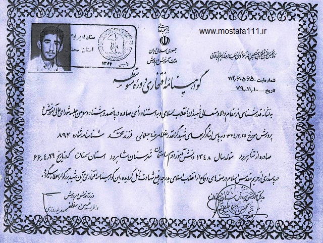 دیپلم افتخاری که مدیرکل آموزش و پرورش شاهرود به این شهید اعطا کرد