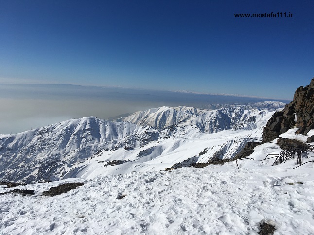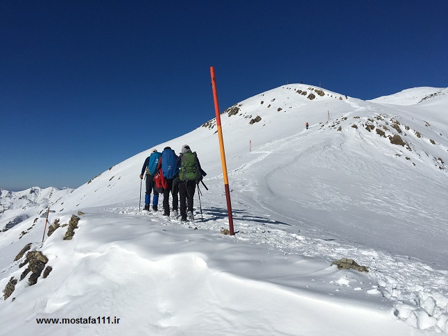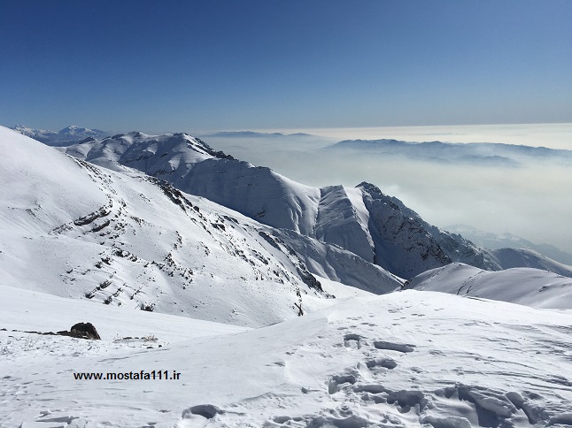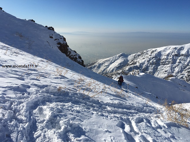 از شیرپلا به بعد، برف خوبی باریده و برف در مسیر و دره ها قابل توجه است، و این مسیر را بدون توقف قابل توجهی یکسره طی کردیم، شیب ها ترسناک و برف پودر شده، نشان از سردی هوا و دمای نزدیک به شش درجه زیر صفر دارد، و باد در قله تقریبا 15 کیلومتر سرعت دارد، که این پودر سفید را از یال ها جاروب کرده و به دره ها منتقل، و جمع می کند، گروه های نسبتا زیادی با ما همنوردند، هوا کاملا صاف و آسمان کاملا آبی است. در حالی که تهران در آلودگی ها و بخار و مه خود غرق است، اینجا هوا صاف و تمیز است.