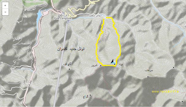 نقشه مسیر صعود از روستای دونا تا قله به رنگ زرد و بازگشت