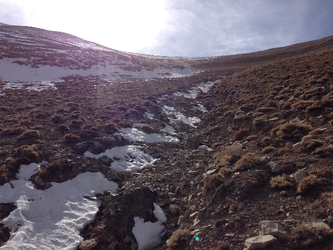 ساعت یازده و شش دقیقه (11/06) یال میان دره ایی مذکور هم، تمام شد و شیب آخرین برای صعود آغاز گردید و در واقع شیب ملایم تر به پایان رسید و شیب اصلی رخ می نماید و از این به بعد با افزایش شیب غلبه بر جاذبه زمین نیز سخت تر می شود. اما برعکس مسیرهای دیگر منتهی به توچال اینجا و در این نقطه هم می توان چشمه هایی حتی کم آب یافت که از آن نوشید و برف های جدید شاید آن چشمه ها را هم فعال کرده است.