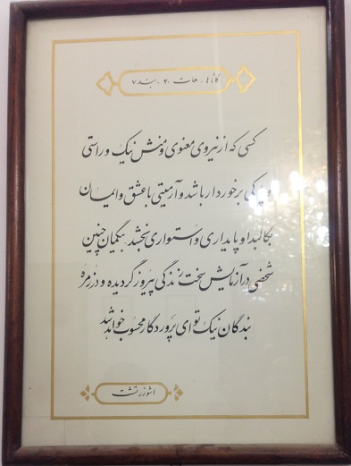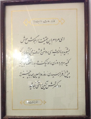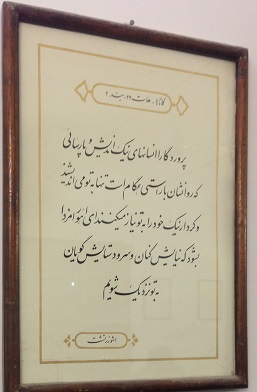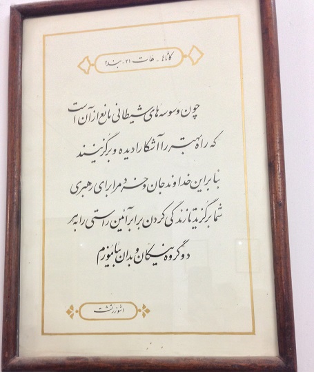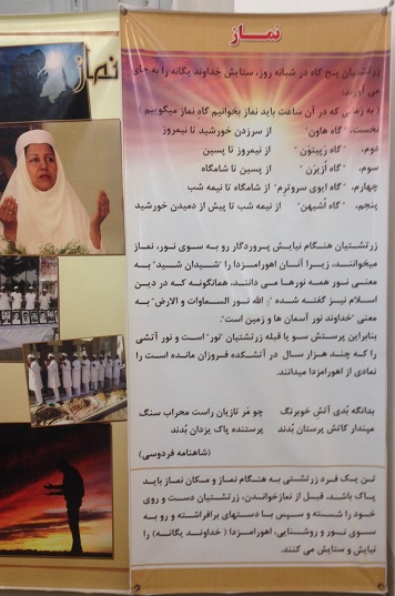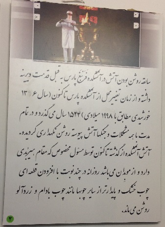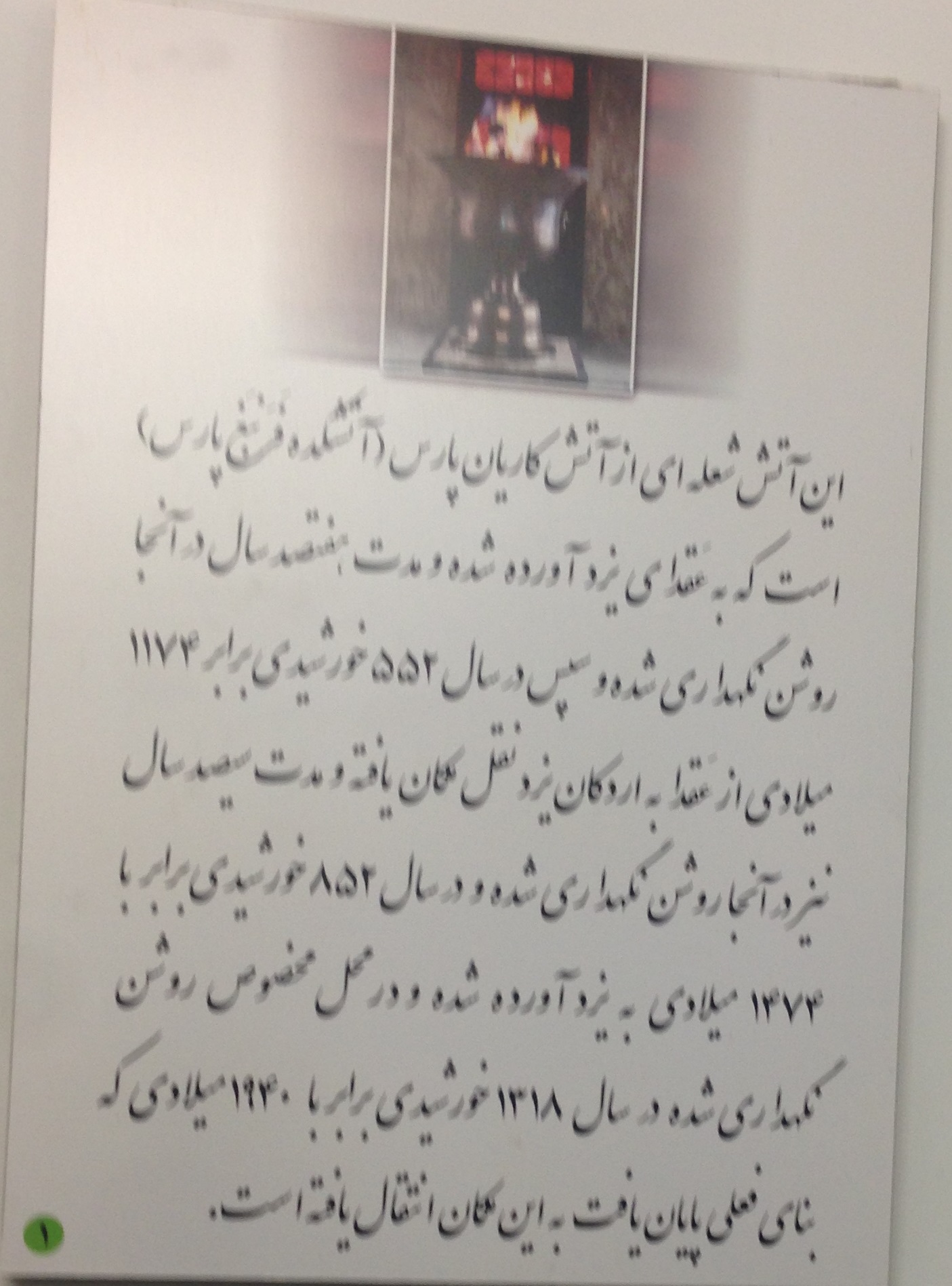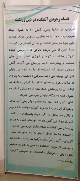 اما متاسفانه من آن موبد بزرگ را ندیدم و حرف های زیادی را با خود به آتشکده بردم و بیرون آوردم، و چون اطراف کعبه، در این آتشکده منابری هم نبود که موبدان به وعظ و خطابه مشغول باشند، تا چون به پارسی سخن می گفتند، لااقل حرف و سخن آنان را یکطرفه بشنوم، و یا اگر فرصتی دست می داد، سوالی کنم و طرح مساله ای شود؛ و همانطور که در سفر حج در اطراف کعبه از سخن سخنرانان نشسته بر منابر صحن خانه خدا، به جهت ندانستن زبان عربی بی بهره ماندم، اینجا از سخن موبدان نیز به علت عدم حضورشان بی بهره شدم. و در فرصت کم حضور تنها به خواندن چند تابلوی نصب شده بر دیوارهای آتشکده چشم دوختم و بعض آنان را خواندم.