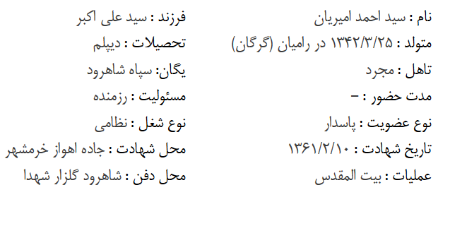 از فروردین 1395 که بر مزار این شهید، در گلزار شهدای شاهرود حاضر شدم، و بر خاک مقدس مزارش ادای احترام کردم، چهار سال می گذرد، همچنان که بر سنگ قبر او این چنین نوشته بودند : "پاسدار شهید سید احمد امیریان فرزند سید علی اکبر، ولادت 1342، شهادت 10/2/1361، که در کربلای خونین شهر به درجه رفیع شهادت نایل آمد. قسمتی از وصیت نامه شهید : ما می رویم تا امام بماند، این رهبری امام بود که این خط سرخ را به من و دیگر شهدا آموخت و من رهبری امام را از دل و جان پذیرفتم".