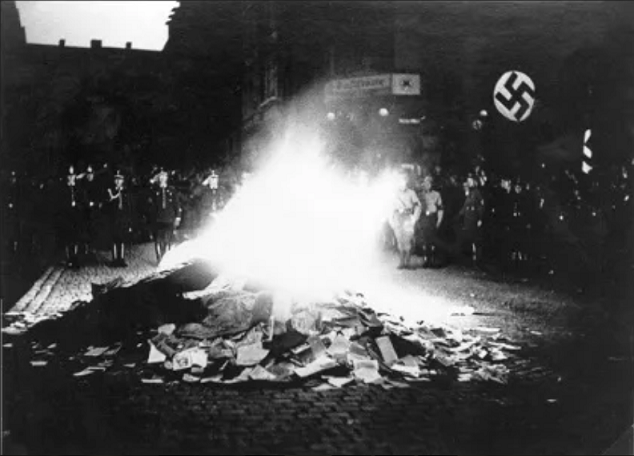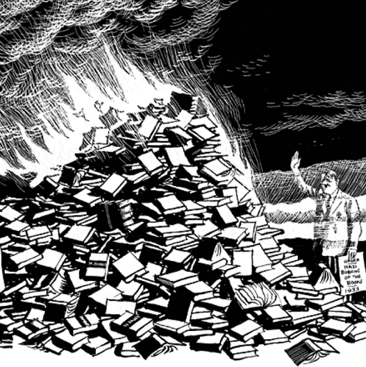 کاریکاتوری از سوزاندن کتاب توسط هیتلر
